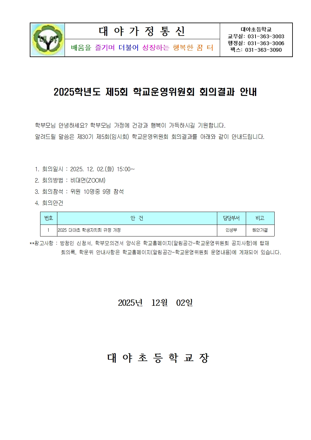 [ÀϹÝ] 2025Çг⵵ Á¦5ȸ Çб³¿î¿µÀ§¿øÈ¸ ȸÀǰá°ú ¾Ë¸²