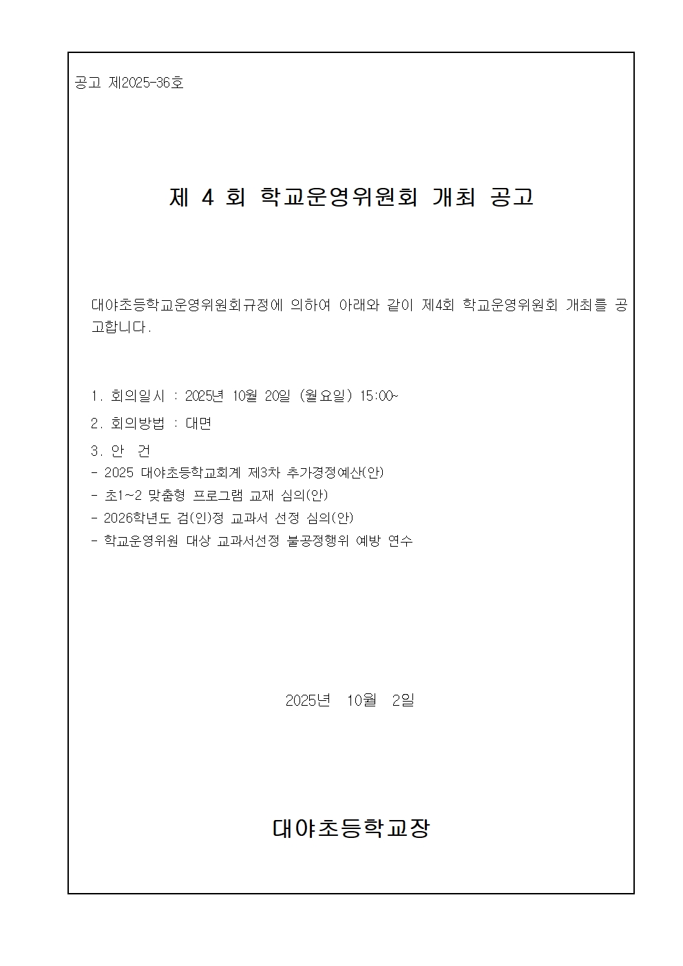 [ÀϹÝ] 2025Çг⵵ Á¦4ȸ Çб³¿î¿µÀ§¿øÈ¸ °³ÃÖ °ø°í